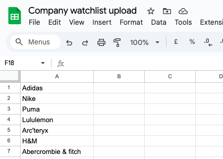 If you have a file with company names, you can also upload an xlsx file with the names as shown in the video. The formatting can be freeform like below, and you will be able to review and choose the right companies in the editor.