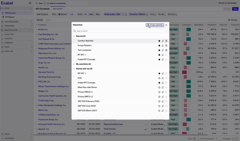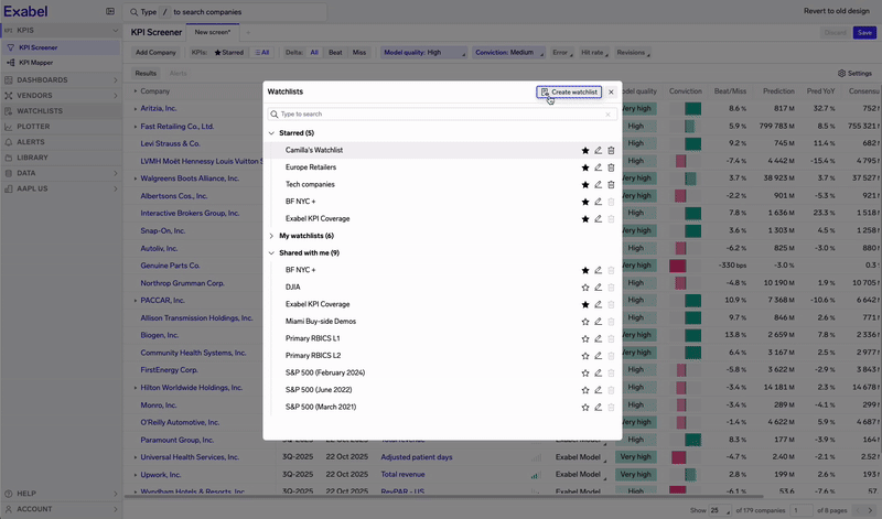 Watchlists allow you to create sets of companies or entities for you to track. Watchlists are static.